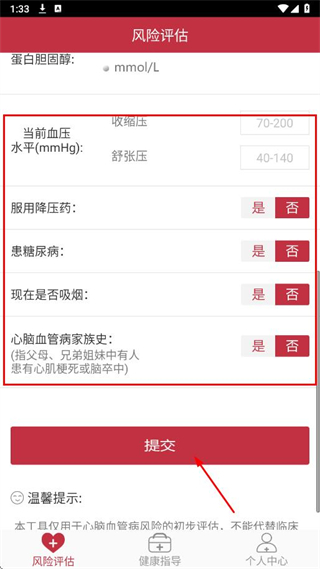 2、继续填写当前血压水平、是否服用降压药、是否患糖尿病、是否吸烟等信息。信息填写完成后,点击提交。