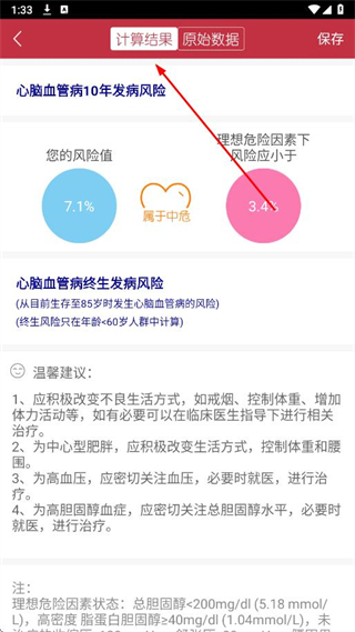 3、提交后即可查看心脑血管病10年发病风险、终生发病风险的计算结果,以及对应的温馨建议。