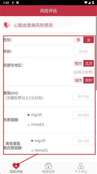 1、在风险评估页面,依次填写性别、年龄、现居住地区、腰围、总胆固醇、高密度脂蛋白胆固醇。