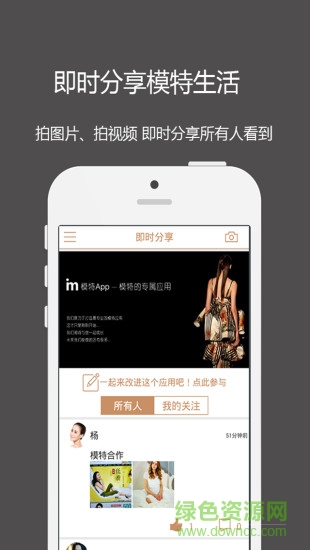 7.即时分享功能,通过图片、视频+文字展示模特个人专业样片、个人简介视频或者分享活动现场及生活点滴,丰富自己的生活圈。发布一个好的分享还能让成千上万用户看到!