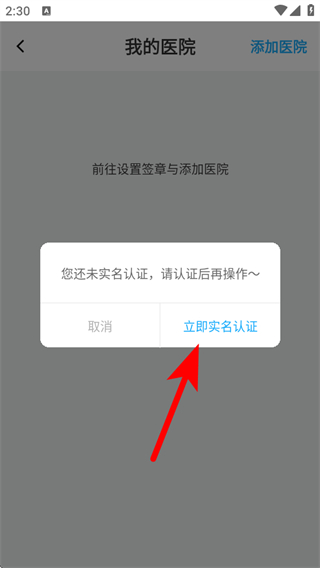 4、根据提示点击立即实名认证,完成实名认证后即可进行医院添加操作。