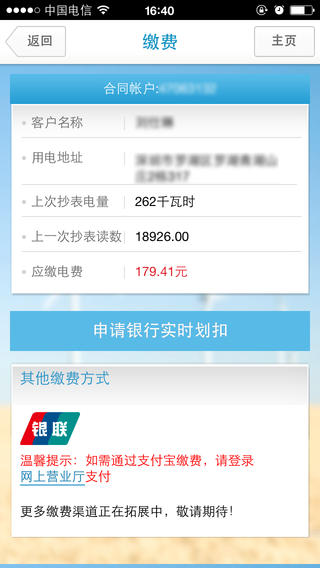 2.掌上缴费:提供自助实时划扣(注:该服务适用于已办理了委托银行代扣的客户)和银联2种缴费方式,无需注册,输入合同帐户即可快捷交电费。PS:对于房屋出租的业主与租户,这个功能很有用噢!