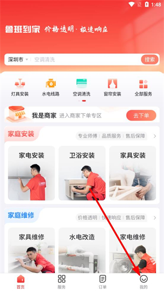 1、在鲁班到家app首页底部,点击我的选项,进入个人中心页面。