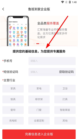 3、在该页面填写手机号、短信验证码,并选择主营行业等信息,点击进入企业版,即可完成商家身份的切换。