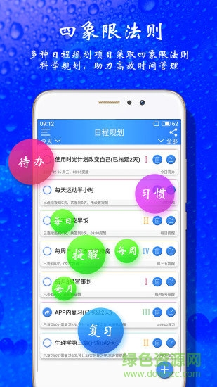 【四象限法则】习惯、复习、待办、(每日、每周、每月)提醒,多种日程规划项目采取四象限法则科学管理,助力高效时间管理。