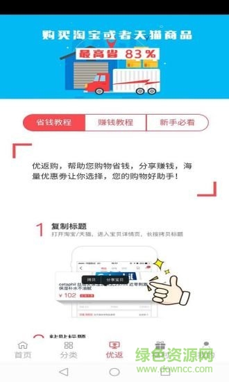 优返购app是为喜欢购物的朋友提供的一款网购返利软件,在这里购物收货评价以后既可为你返现哦,而且不同的店铺所带来的返利程度也不相同哦,让你在购物的同时就能省下一笔不小的数目哦,感兴趣的用户欢迎来绿色资源网下载使用。