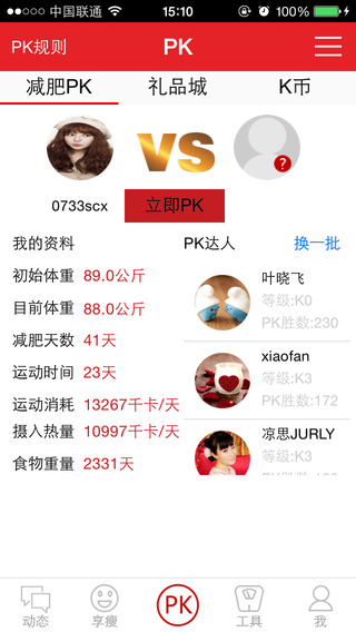 (5)PK:将用户的减肥成果与社区其他成员对比,赢的一方将获得奖励。