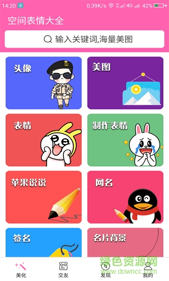 空间表情大全是一款集齐当下热门表情,头像,背景,壁纸等一系列图片的软件,你还在担心自己空间的装扮千篇一律而没有突出点吗?还在为想网名,个性签名而苦恼吗?他能让你的空间变得焕然一新,还有当下最潮流的网名以及签名,快乐,感概,忧郁等类型的都在这里可以找到,想要俱就来绿色资源网下载吧!