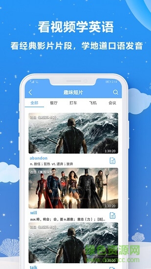 根据商场、餐厅、酒店、机场、飞机、打车、会议7大场景,分类展示短片列表,视频对白与专业词库智能匹配,重点单词在播放时高亮显示,点击即可查阅单词解析,还可一键加入单词本反复学习;