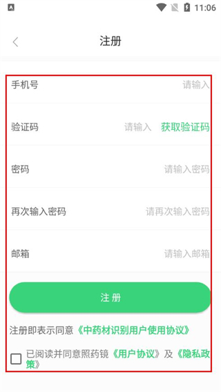 3、填写手机号、获取并输入验证码、设置密码并再次确认、填写邮箱,勾选同意协议后点击注册。
