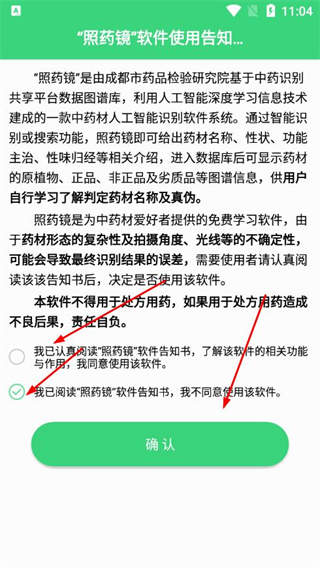 1、打开照药镜app,选择我已认真阅读‘照药镜’软件告知书,我同意使用该软件并点击确认。