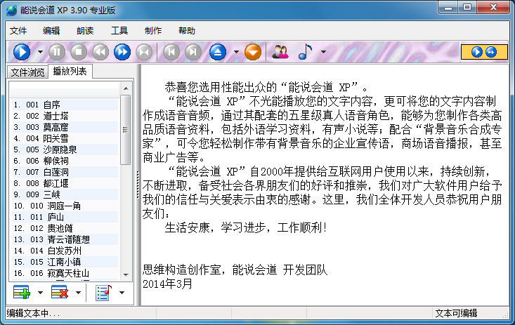能说会道XP专业版是一款面向专业用户的语音朗读软件。软件功能强大,内置独创的中英文双语内核,可以同时设置中文语音角色、英文语音角色及各自的朗读语速,解决了使用单个语音角色不能兼顾多种语言朗读的问题,是真正的中英文混合朗读。软件还有一大特色-内置重复朗读功能,比如你收听到一些关键内容,就可以反复多听几次;还可以语音学习。总之功能很强大,赶快下载体验吧!