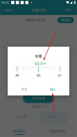 3、在弹出的体重调节窗口中,调整到目标体重数值,点击确认。
