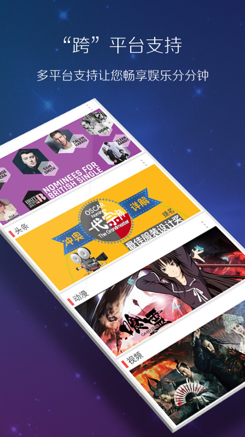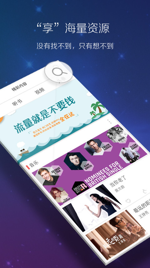 涵盖音乐、听书、视频、动漫、微电影、应用推荐,只需一个应用,就能享用全部娱乐内容。