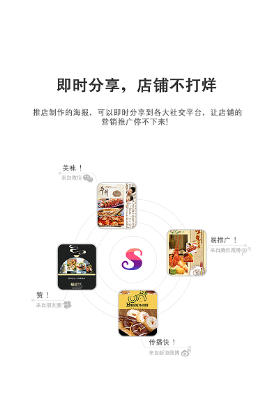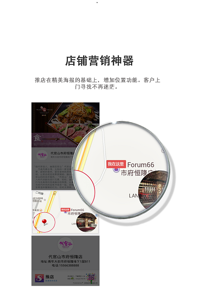 1.推店支持将店铺的位置合成到海报当中。可以快速的分享到微信、微博等公众平台,让店铺推广更加的精准。