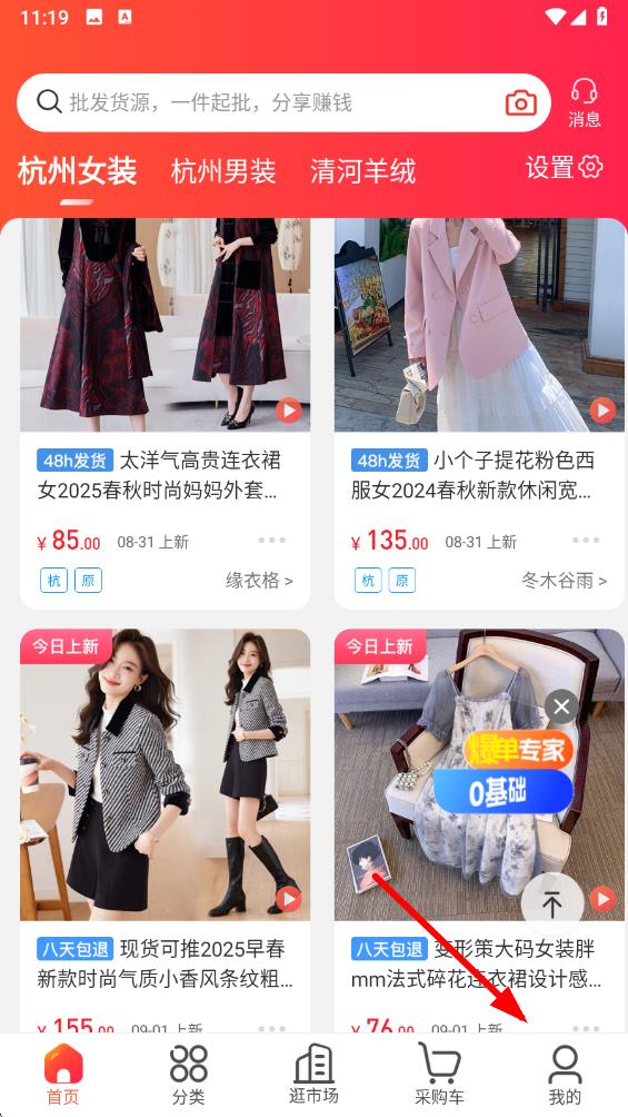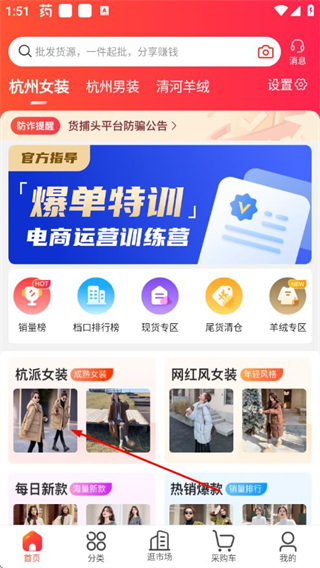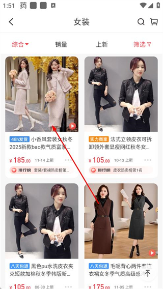 1、打开货捕头APP,在首页选择女装类目,进入女装商品列表页。