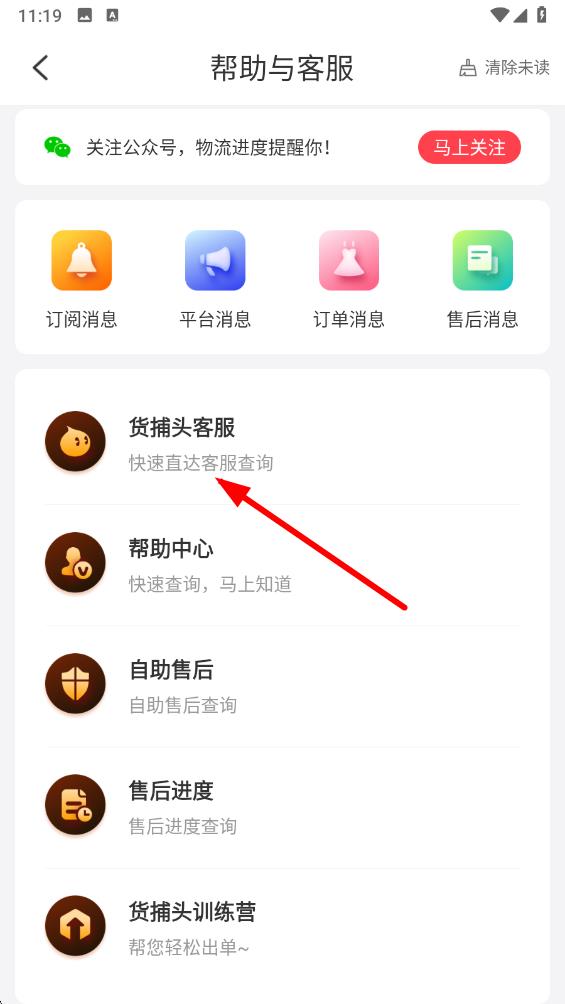 3、在帮助与客服界面里,找到货捕头客服选项,点击即可快速直达客服进行咨询,解决您在使用过程中遇到的问题。