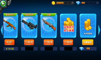 1.点击图标进入游戏,购买钻石和武器,装备购买的武器,升级到不能升为止