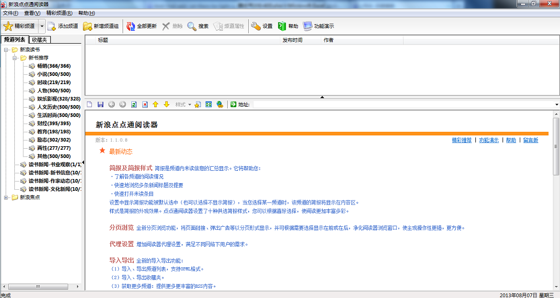 1.工具栏 位于阅读器标题栏下方。基于用户习惯,这里设置了“新建,查看,精彩推荐和帮助”四项。添加删除频道、频道组,更新排序,频道属性设置等操作均能在这里完成。
