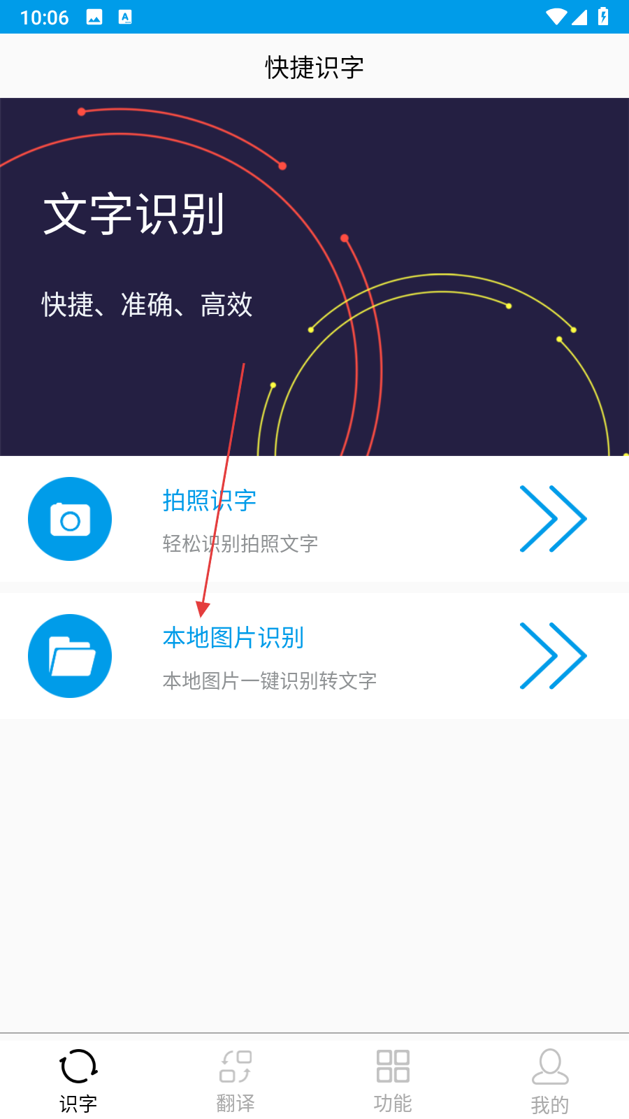 1、打开拍图辨字大师APP,在快捷识字页面点击本地图片识别选项。