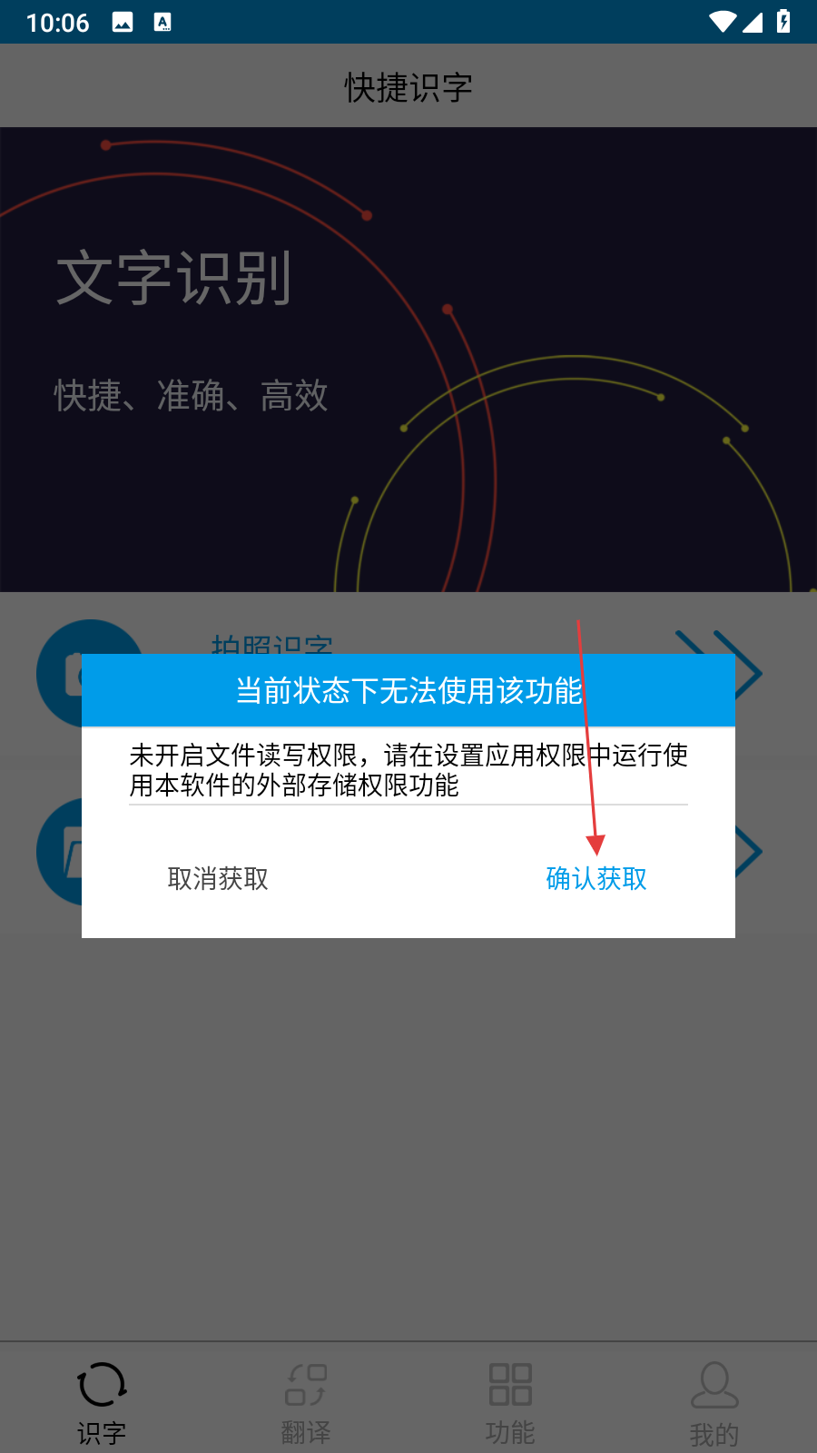 2、若弹出未开启文件读写权限的提示框,点击确认获取按钮,前往设置开启应用的外部存储权限。