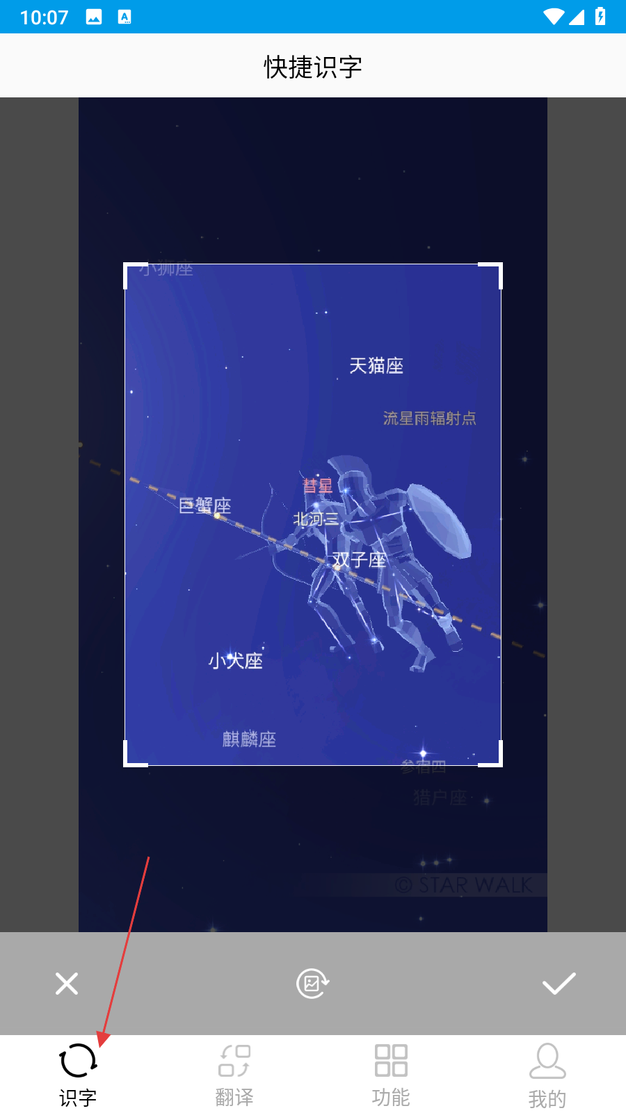 4、图片选中后,进入识别预览界面,确认识别区域等设置无误后,点击打勾即可完成本地图片的文字识别操作。