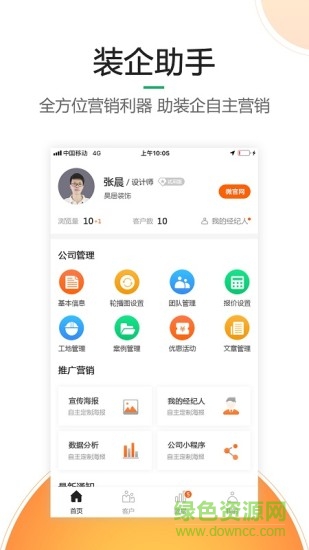 装企助手手机版是一款好用的互联网营销app,支持进行团队、工地、案例等多方面的管理,精准销售和获得人脉,欢迎喜爱的朋友到绿色资源网下载使用!