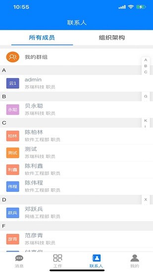 3、企业员工在线沟通交流,随时查看同事联系方式。