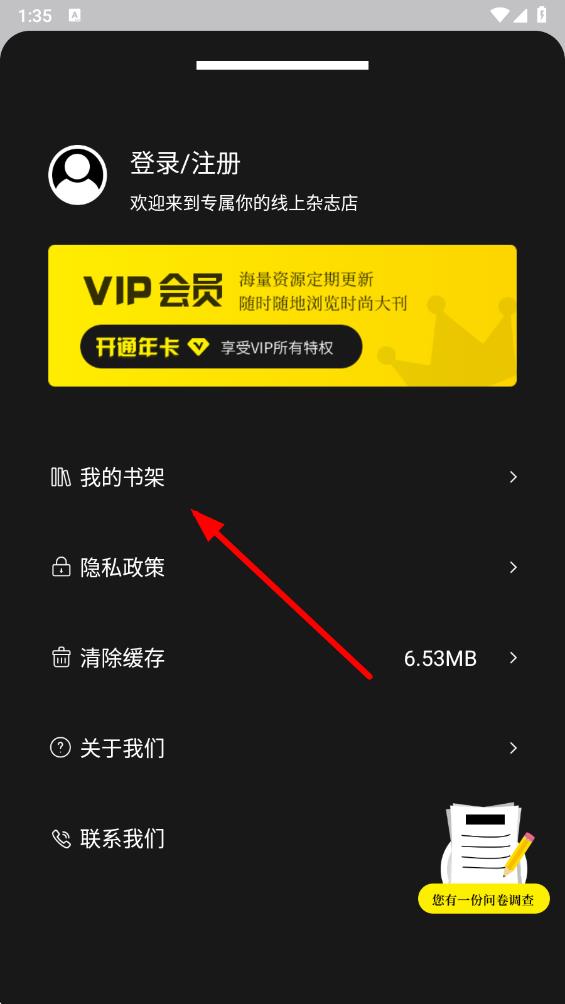 2、在个人中心界面,找到并点击我的书架选项,进入我的杂志页面。