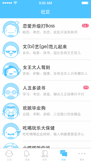 男神女神、男屌女汉的极乐净土,“恋爱升级打boss”、“文(bi)艺(ge)范儿起来”、“女王大人驾到”、“人丑多读书”、“欢脱毕业狗”、“吃喝玩乐大保健”、“小嗒嗒听你说”等社区板块,总有和你志(chou)同(wei)道(xiang)合(tou)的基友、闺蜜。