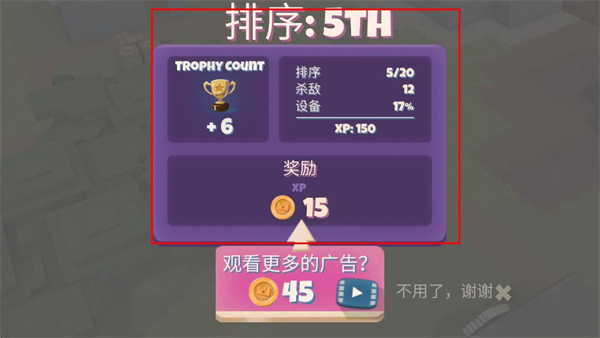 4、结束战斗后,查看排序及奖励界面,获取对应的奖杯与经验奖励。