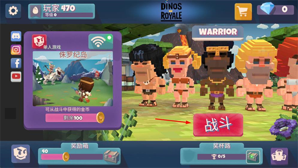 1、进入游戏主界面,点击“战斗”按钮,进入侏罗纪岛的战斗场景。