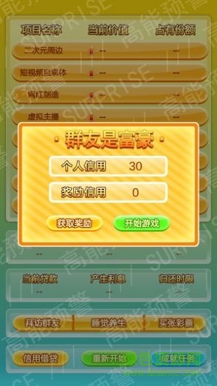 群友是富豪是一款模拟经营类的游戏,在游戏中,玩家的梦想就是要做一名富豪,现在市场上有许多的投资项目,如果投资好了,就可以赚取更多的收益,如果投资失败,将一无所有,所以有一双慧眼还是非常重要的,再合适的时机将这些抛售出去可以赚一大笔,最终成为富豪,感兴趣的朋友可以来绿色资源网下载体验!