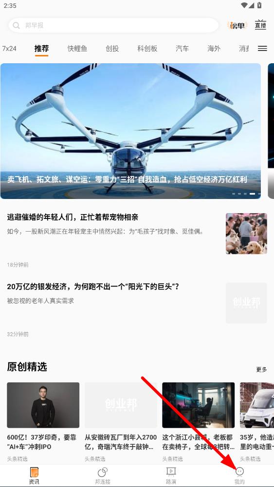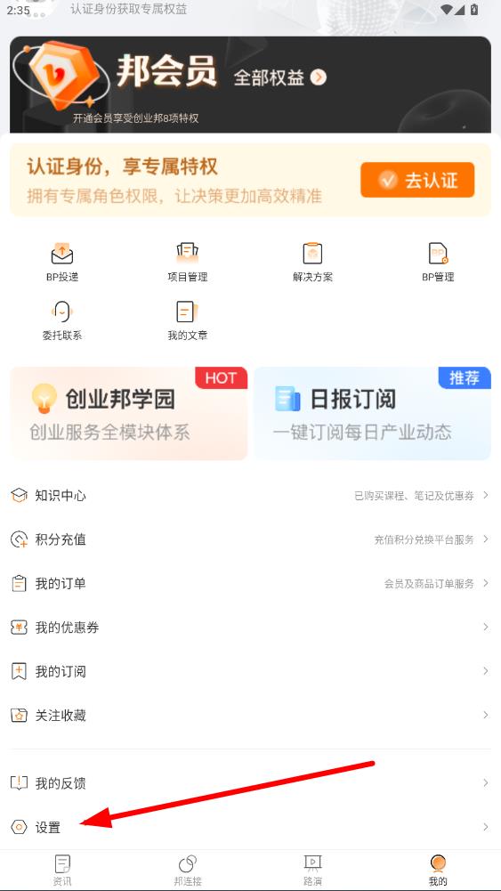 1、打开创业邦APP,点击底部导航栏最右侧我的选项,进入个人页面。