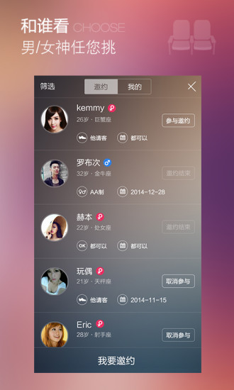 双人座ios版是一款将各类演出作为社交切入口的交友软件,方便用户找到相同兴趣的人一块看演出。购票服务方面,双人座是跟格瓦拉、中演票务通、东方票务、聚橙等票务公司合作,和全国各地各个剧院都有密切的合作关系,支持银联和支付宝付款。之后,团队还将增导入团购演出票业务以及在线选座服务。