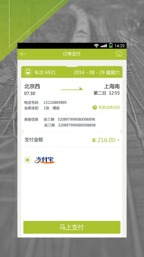 快订火车票提供了全国火车票的在线查询和预订服务,与铁路官方数据实时同步,为用户提供方便、一流的火车出行服务。(预订成功后短信及时通知,更有发车前温馨提示,到站地天气提醒服务)