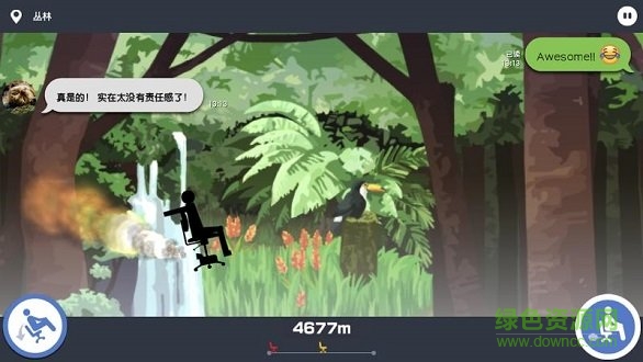 2、然后两个火柴人就坐着他们改装椅子,开始了一场由逃班引起的、惊心动魄的生死角逐。玩家只能控制两个按键,简单说来就是后翻和油门。只有不断地加速,尽可能地延长滞空时间,同时维持好座椅的平衡,这样才能在老板的穷追不舍下走得更远。