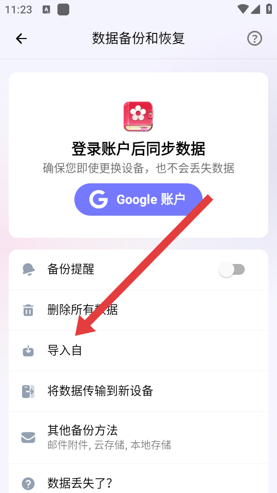 3、在数据备份和恢复的页面,点击导入自选项,调出导入来源选择弹窗。