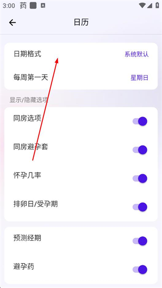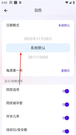 3、在日历设置页面点击日期格式选项,弹出日期格式选择弹窗。