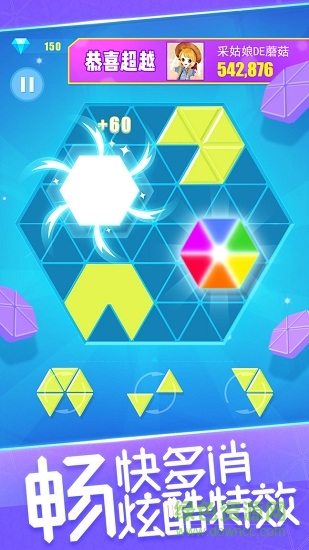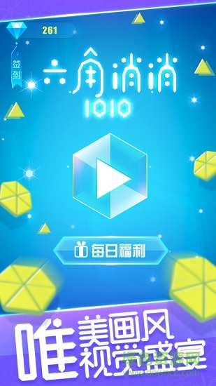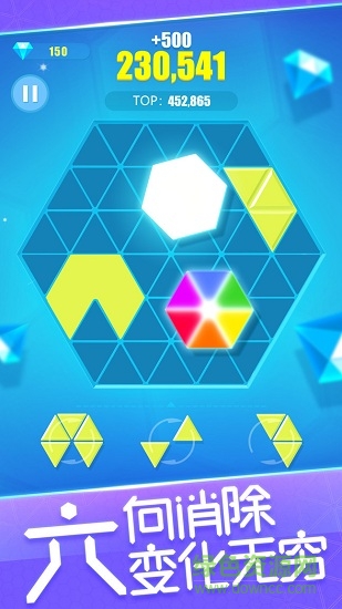 2019全新消除游戏六角消消1010来啦!六角消消1010是一款非常新颖的消除游戏。游戏中,玩家将根据系统给定的图形组合放置在指定区域中,循环往复进行不断组合。若组合的图形中形成一个或多个正六边形组合则达成消除条件进行消除。一次消除的正六边形越多得分越高!当指定区域内无法放置图形组合时则游戏结束,结束时的积分越高则排名越高,同时获得的钻石奖励也越多呦!