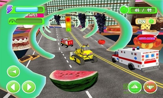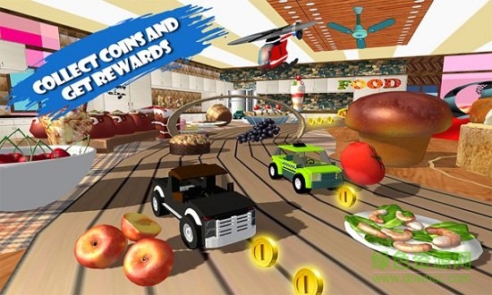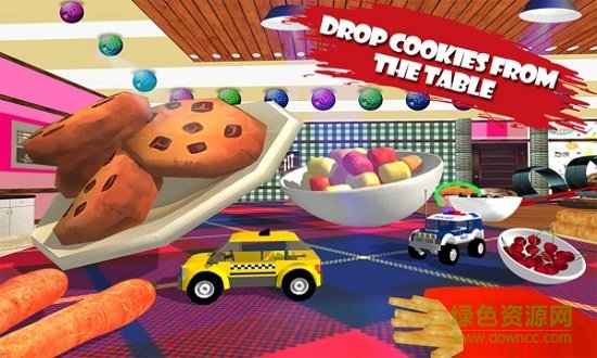 4.驾驶各种迷你的小型玩具车与庞大的食物冒险挑战,自由的摧毁各种美味的食物;