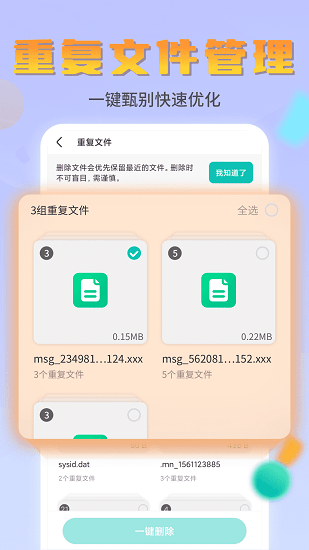 【重复文件管理】自动甄别重复文件,一键处理,缓解内存压力,还有更多优化功能,让您的手机更快更轻松!