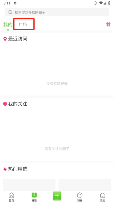 3、接着我们要想要建立属于自己的论坛圈子,可以在最上方查看到广场栏目进行了解信息;