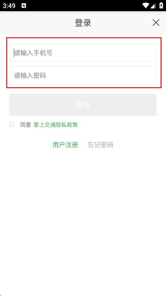 4、在登录页面,分别在“请输入手机号”和“请输入密码”输入框中输入手机号和密码,勾选“同意 掌上交通隐私政策”,然后点击“登录”按钮,完成账号登录操作。