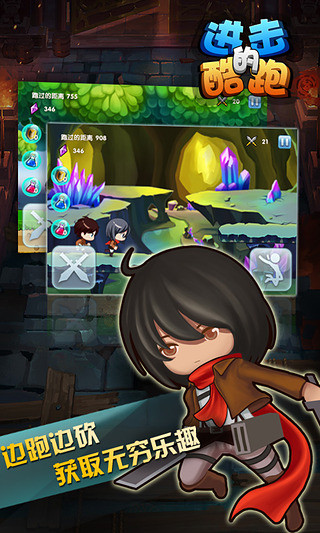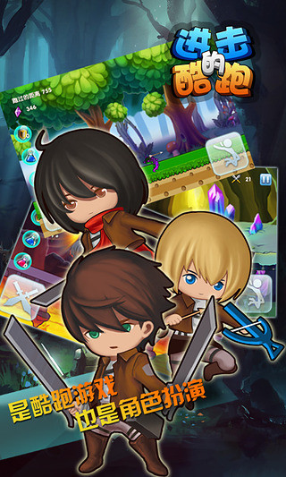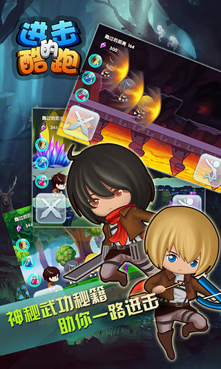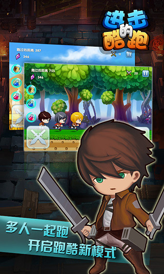 进击的酷跑是一款以动漫进击的巨人为游戏背景的趣味另类跑酷游戏。玩家可化身为艾伦、三笠、兵长在崎岖的道路上一路狂奔,击倒一切敢于阻挡你前进的障碍,杀死所有出现在你面前的巨人,更可以在紧急关头使出杀手锏,化险为夷。喜欢的玩家赶快下载体验吧!!!