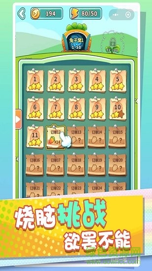 消灭萝卜是一款休闲类性的解压游戏,在游戏中,玩家将要控制一只兔子来收集自己最喜欢的胡萝卜,游戏中有超级多精彩的关卡,每一关的难度都是不一样的,感兴趣的朋友就来绿色资源网下载体验!
