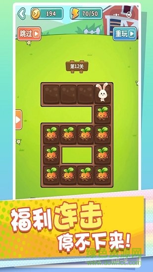 游戏界面遍布胡萝卜,玩家扮演兔子收集萝卜,兔子会随玩家手指滑动的方向移动,每次操作兔子都会运动到泥土的边缘。玩家需要将所有的萝卜全部收集才能进行下一关。