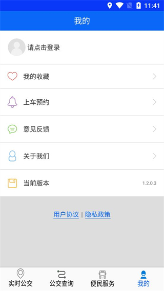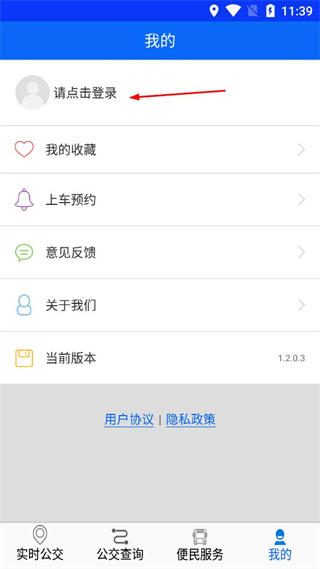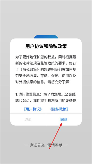 1、打开庐江公交软件,处理用户协议和隐私政策弹窗,点击同意后进入主界面。