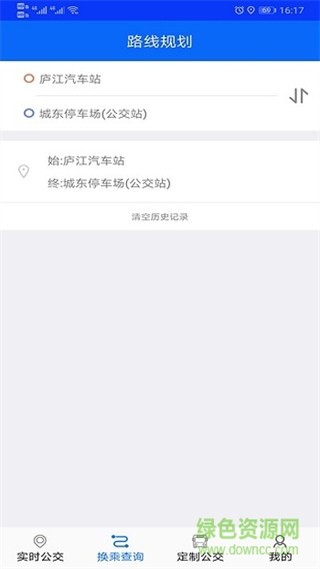 3、在路线规划页面填写起点庐江汽车站和终点城东停车场公交站,发起路线查询。