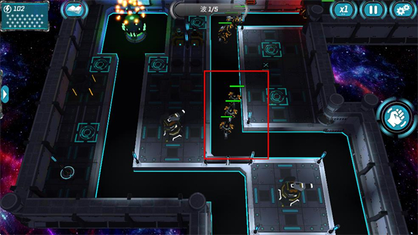 3、点击界面上方的下一波按钮,触发敌人进攻,观察防御单位对敌人的拦截效果。